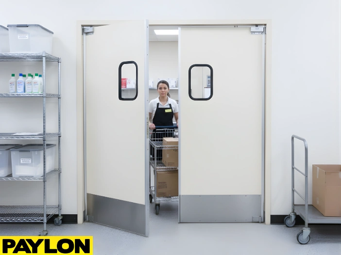 Absolutely. Double-acting hinges allow hands-free entry and exit. Vision panels in models such as the PE-510HPL reduce collisions in high-traffic zones.