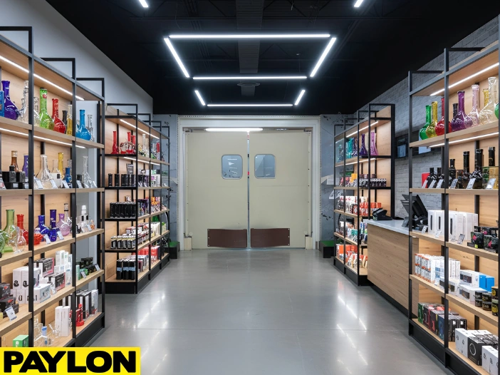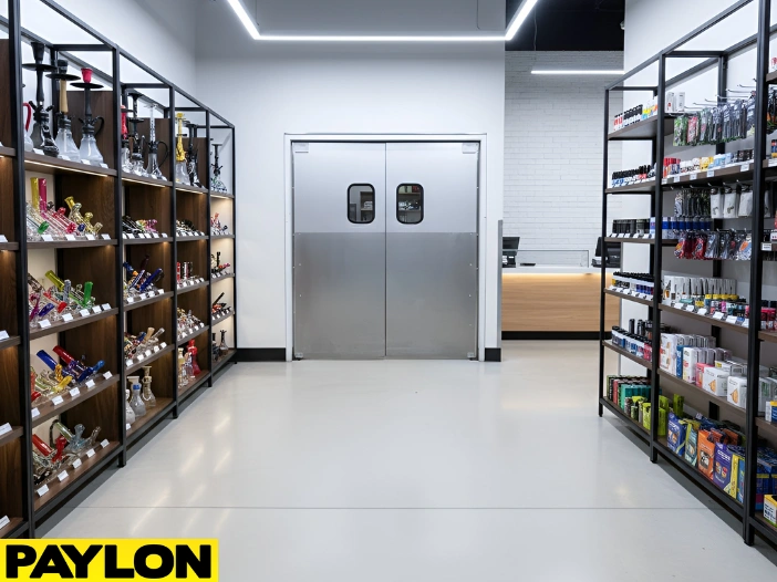 Yes. PE-series doors can be installed at entrances, counters, and backrooms to improve traffic flow throughout the smoke shop.