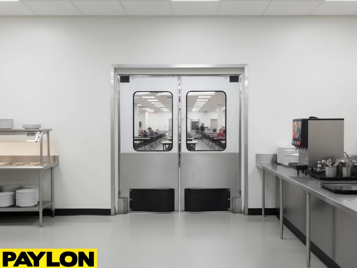 Swinging doors with clear vision panels and soft-close hinges improve visibility and help prevent collisions in tight corridors. Models like the PE-710 reduce blind spots and create smoother transitions between rooms.