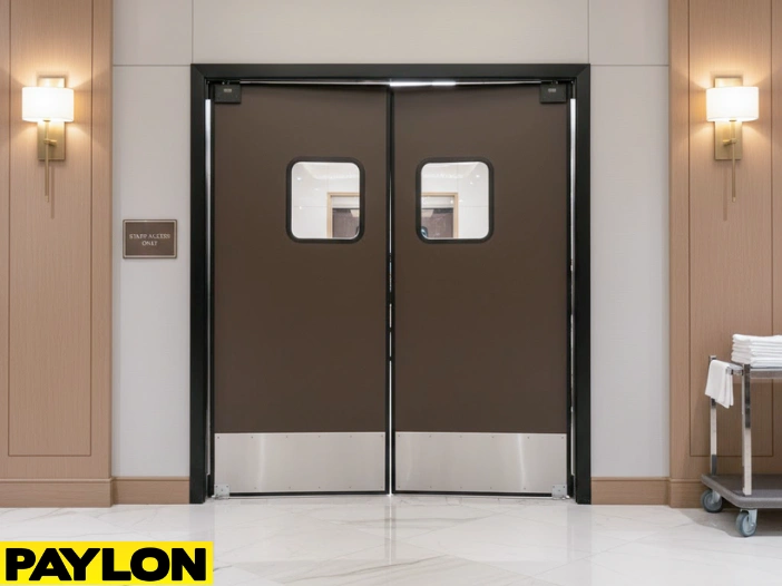 Choose swinging doors with clear vision panels and quiet return hinges. Good fit: PE-710 or PE-720.