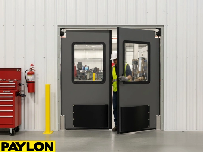 Steel and industrial swinging doors handle heavy impact and frequent cycles, perfect for long-term use. Good fit: PE-8000 or PE-9000.